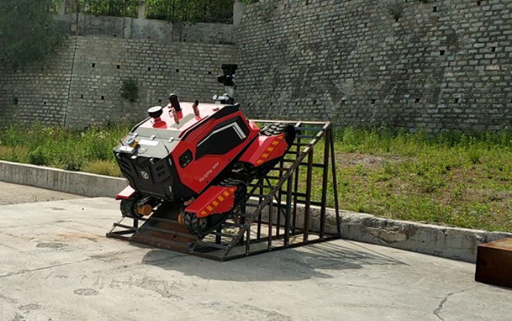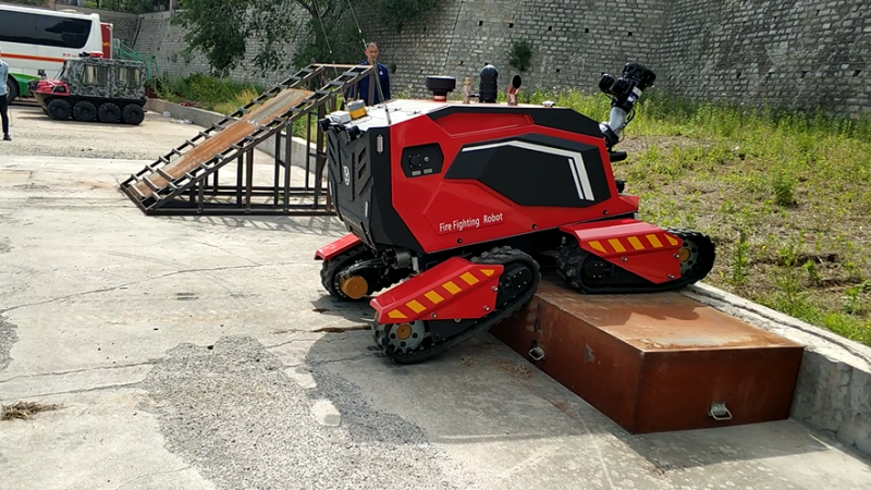 在驗收現(xiàn)場,根據(jù)山東消防救援總隊提出的驗收標(biāo)準(zhǔn),與同行競品分別進行了垂直越障、S型行走、45度爬坡、單邊橋行進、拖拉水帶行走、射水距離、夜間盲操等性能測試。